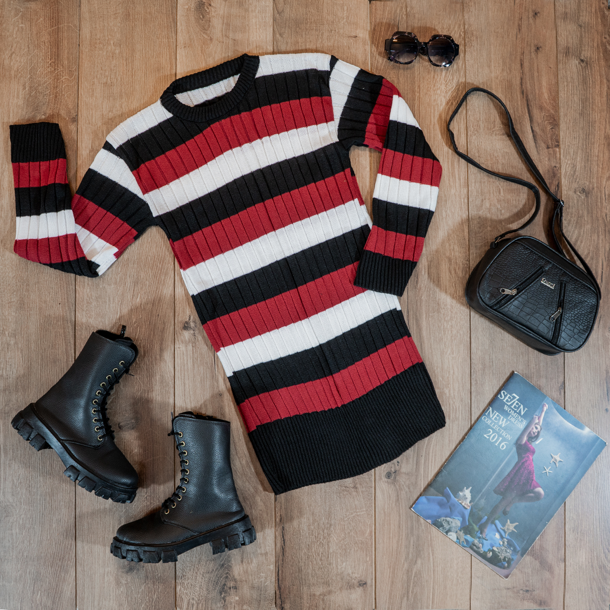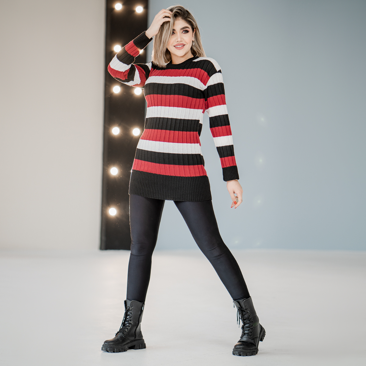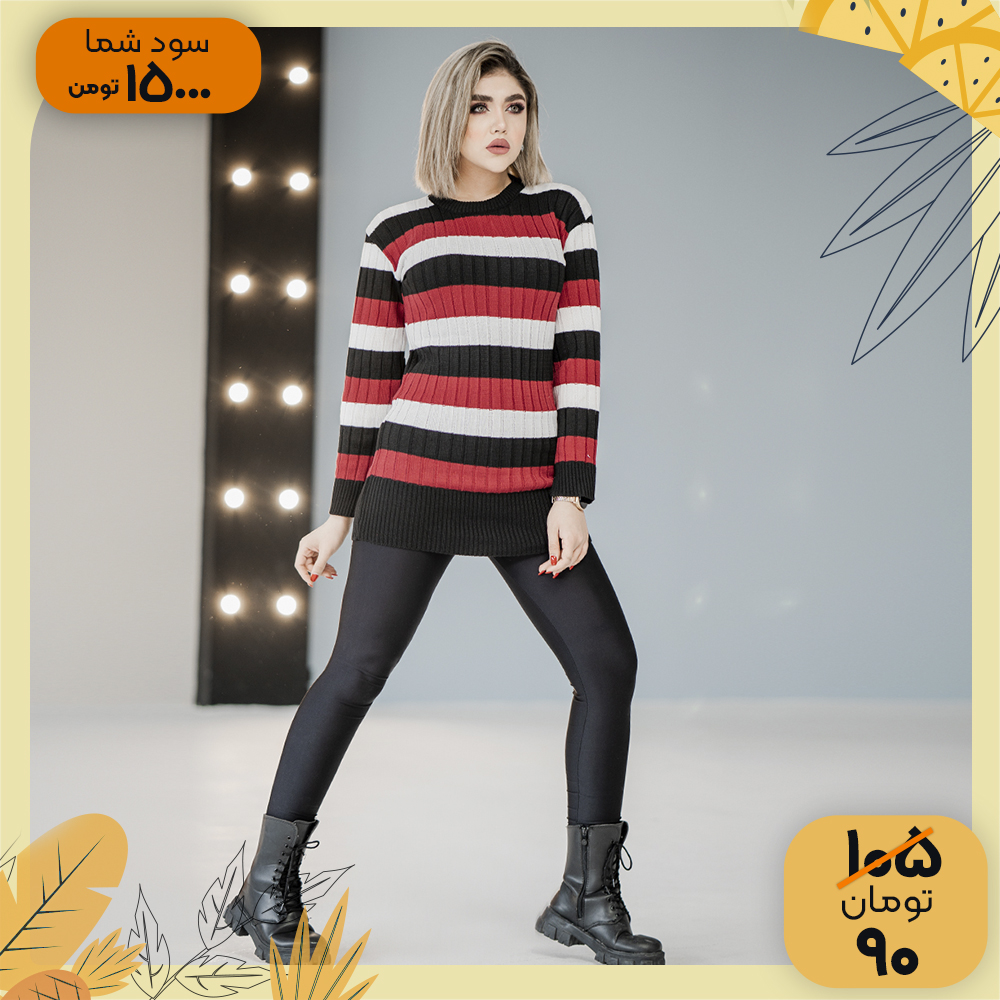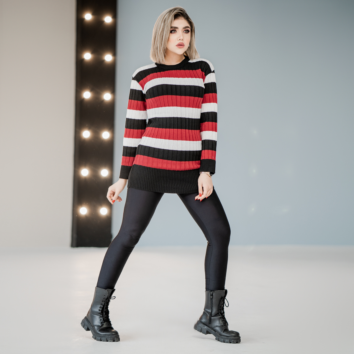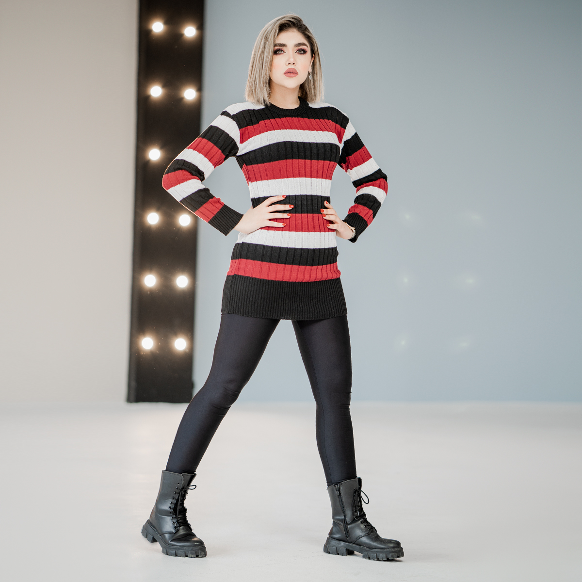 تونیک بافت زنانه راه راه قرمزمشکی مدل kareno