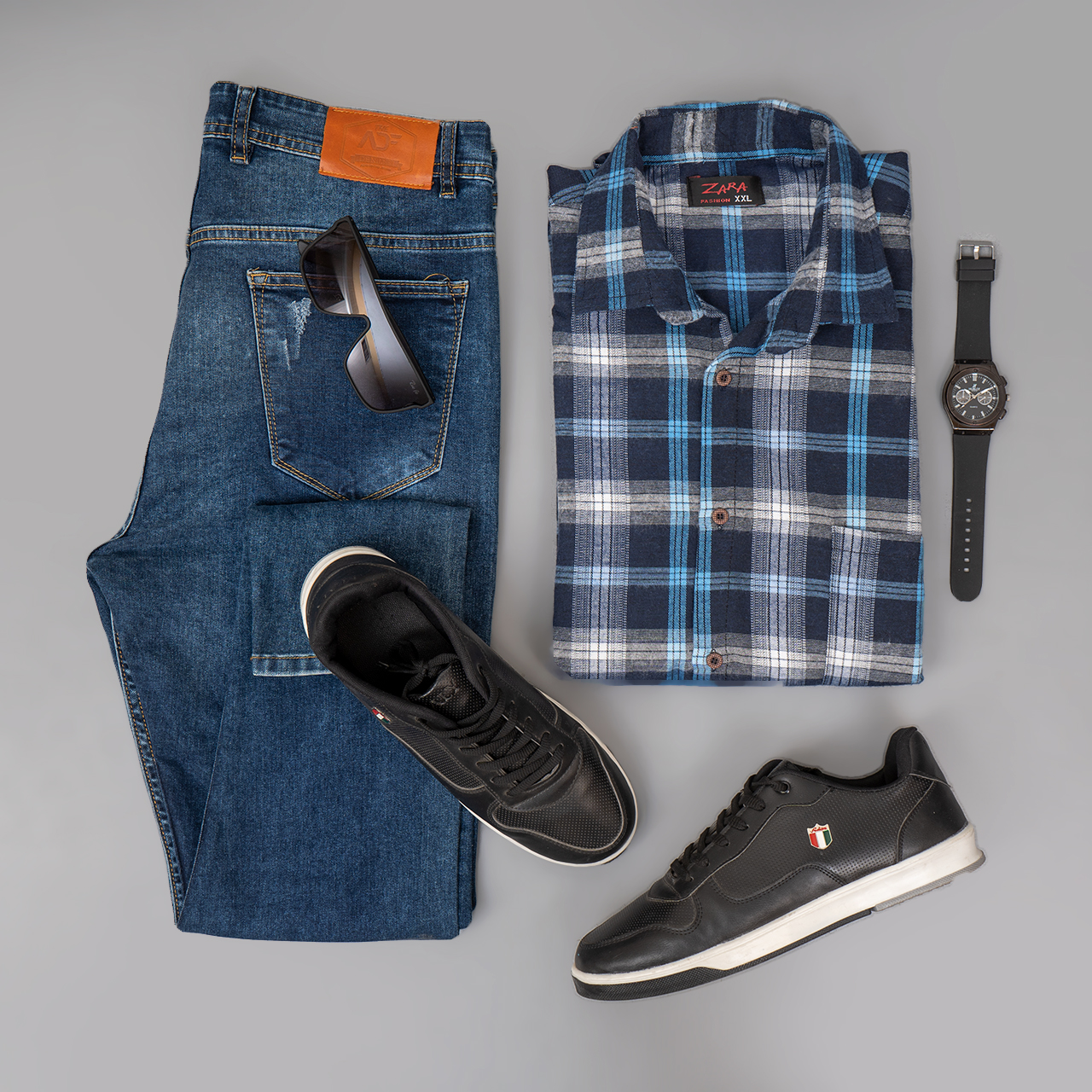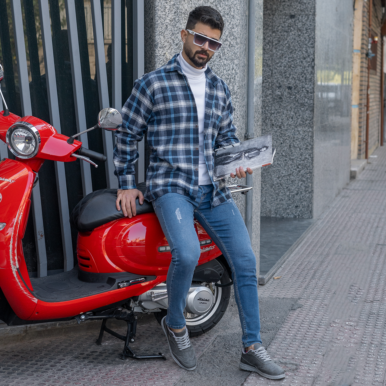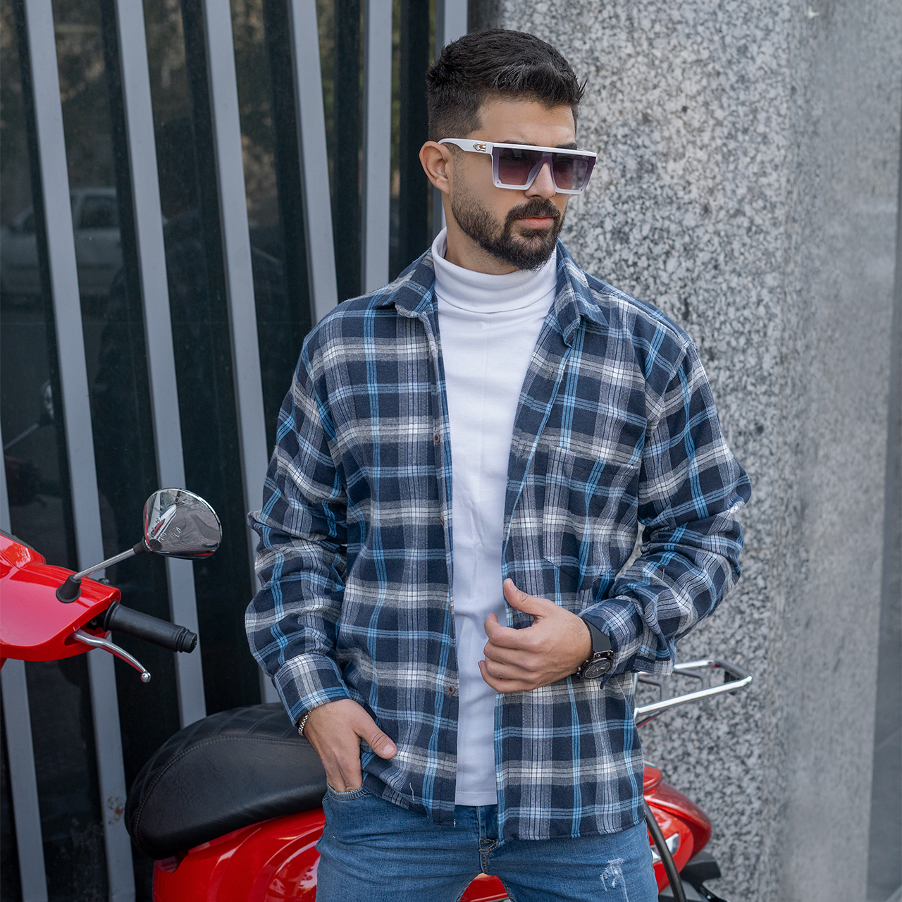 پیراهن مردانه چهارخونه آبی سرمه ای مدل BEHRAD
