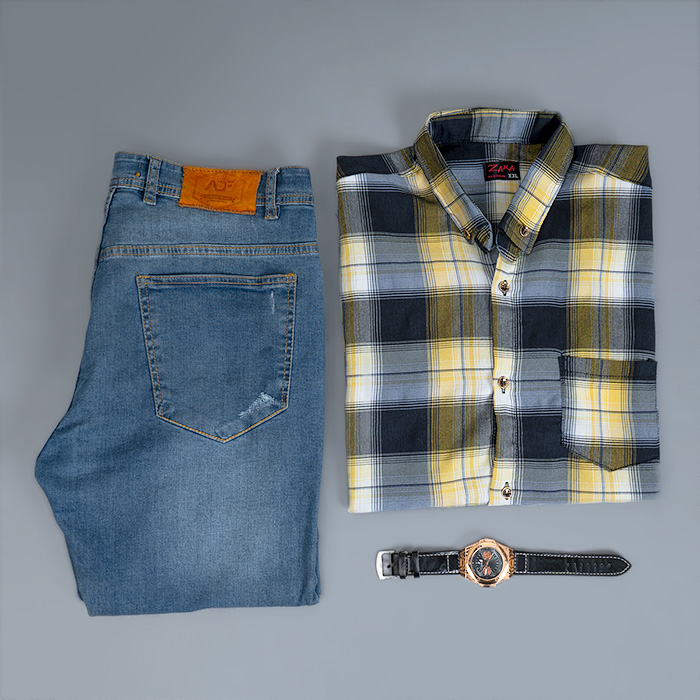 پیراهن مردانه چهارخونه زرد سرمه ای مدل Robert