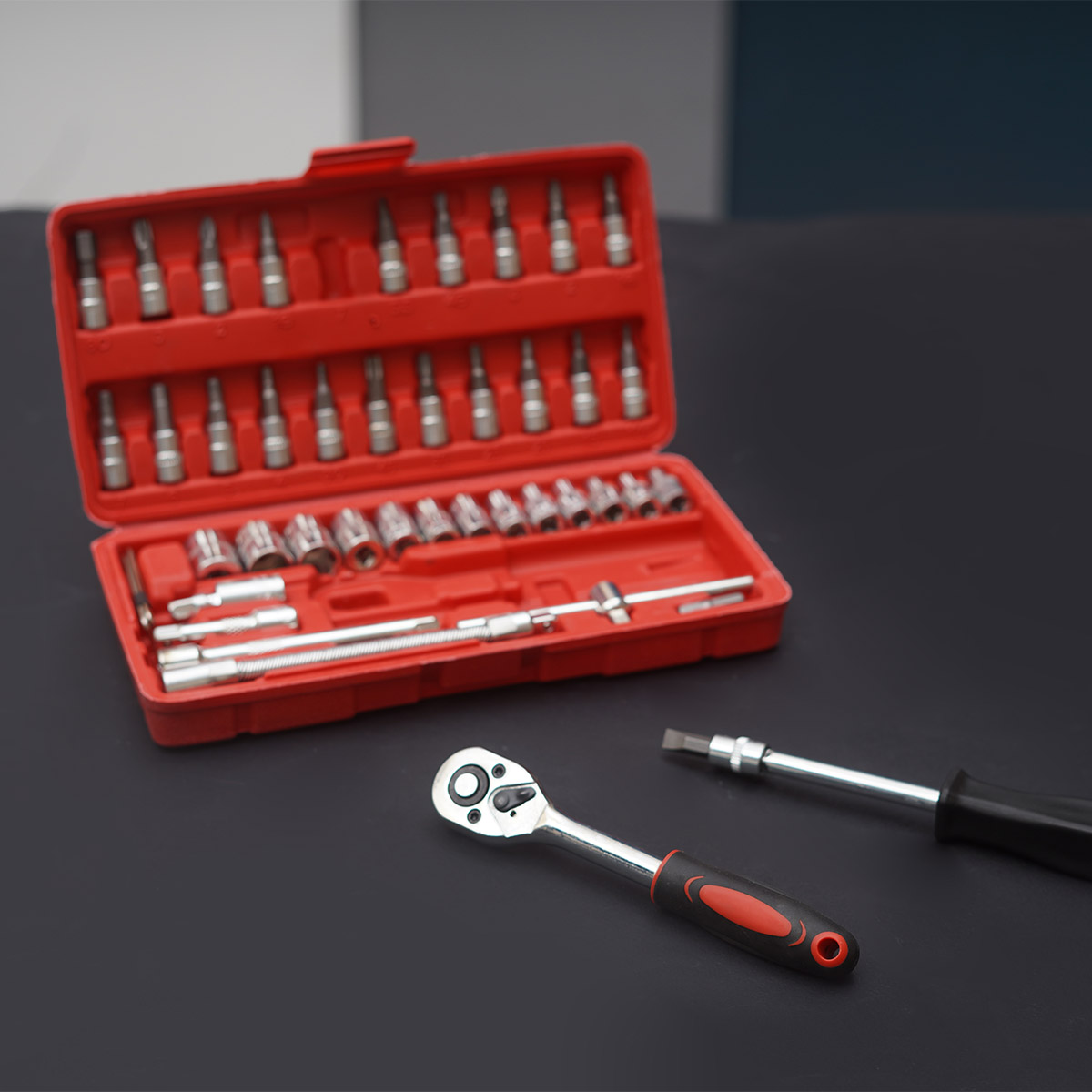 سایر توضیحات : سری آلن , چهار سو , چهار سوی خاردار , دو سو , بکس , ستاره‌ای تعداد ست ۴۶ عددی کاور دارد جنس کاور پلاستیکی با ابعاد ۲۴ × ۱۳ × ۵ سانتی‌متر سایر توضیحات شامل:, - ۱ عدد آچار جغجغه‌ای به طول ۱۵سانتی‌‎متر با درایو ۱/۴ اینچ, - ۱ عدد دسته‌ی پیچ‌گوشتی به طول ۱۵ سانتی‌متر با درایو ۱/۴ اینچ, - ۲ عدد افزاینده‌ی طول در سایزهای ۱۰ و ۵ سانتی‌متر, - ۱ عدد افزاینده‌ی طول فنری ۱۴سانتی‌متری, - ۱ عدد آچار T به طول ۱۱.۵ سانتی‌متر, - ۱ عدد سری آلن, - ۳ عدد آچار آلن با طول ۴.۵ سانتی‌متر, - ۲۱ عدد سری پیچ‌گوشتی شامل: ۳ عدد سری پیچ‌گوشتی چهارسو خاردار در سایزهای PZ۱ ،PZ۲ و PZ۳ و ۳ عدد سری دوسو در سایزهای SL۴ ،SL۵.۵ و SL۷ و ۳ عدد سری چهارسو در سایزهای PH۱ ،PH۲ و PH۳ و ۶ عدد سری آلن ستاره‌ای در سایزهای T۱۰ ،T۱۵ ،T۲۰ ،T۲۵ ،T۳۰ ،T۴۰ و ۶ عدد سری آلن در سایزهای HEX۷ ،HEX۶ ،HEX۵ ،HEX۴ ،HEX۳ ،HEX۸, - ۱۳ عدد سری بکس در سایزهای ۴، ۴.۵، ۵، ۵.۵، ۶، ۷، ۸، ۹، ۱۰، ۱۱، ۱۲، ۱۳ و ۱۴ میلی‌متر, - ۱ عدد لقلقه به طول ۴ سانتی‌متر, - وزن کل: ۱۲۲۰ گرم