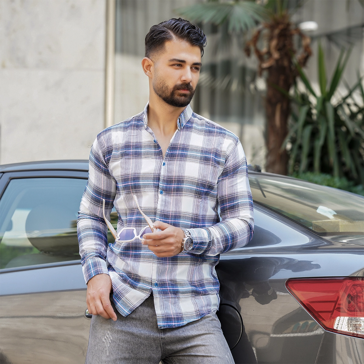 پیراهن چهارخونه آبی سفید مردانه مدل Sany