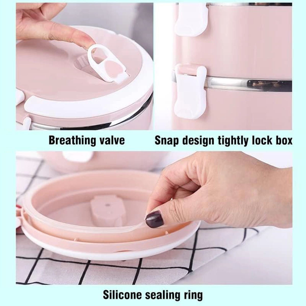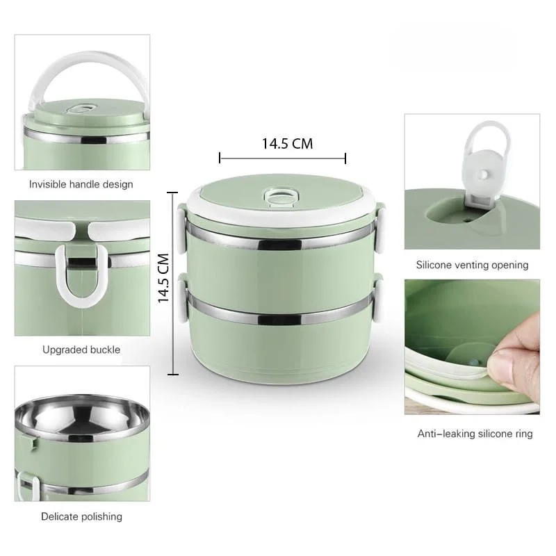 درب بالایی دارای یک واشر ضد نشت است که به بردن انواع خورش ها، ماست و غذا های آبکی بدون نگرانی از نشت کمک می نماید. بر روی ظرف بالایی یک سوپاپ هم وجود دارد تا در صورت نیاز باز نموده و بخارها را خارج گردانید. وزن بسیار سبک، دسته حمل و قفل های مخصوص از دیگر ویژگی های این محصول می باشد.
