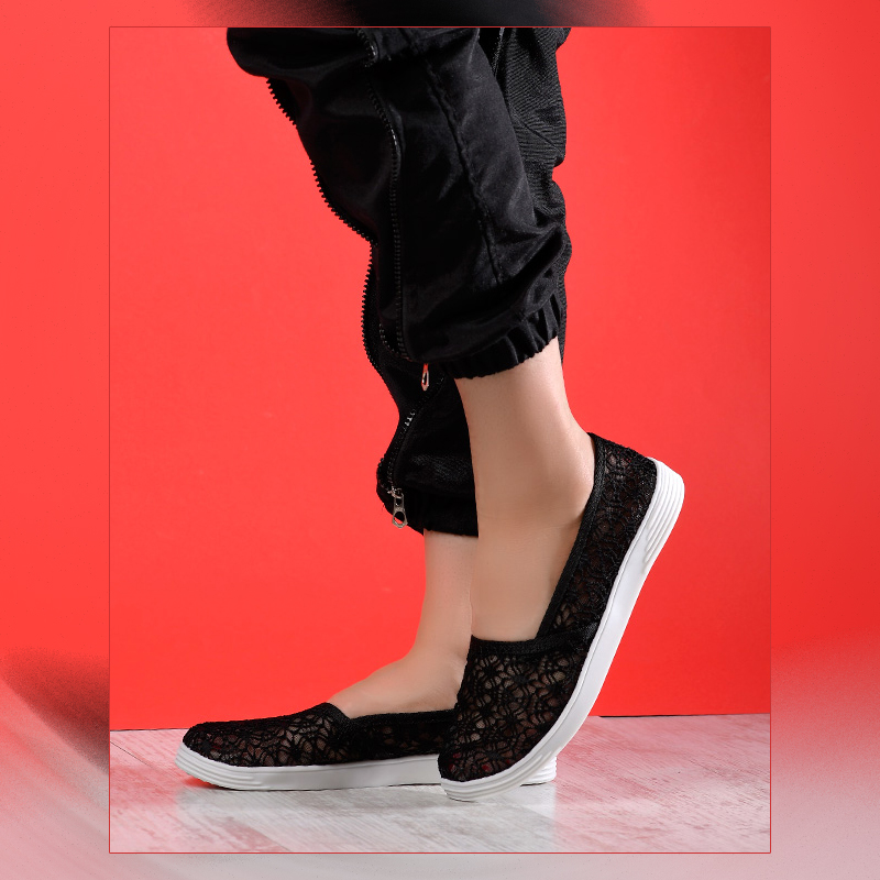 جنس قسمت رویی کفش از پارچه ی دانتل دارای طرح گل می باشد که به آن زیبایی خاصی بخشیده است. رنگ کفش مشکی است که به آن حالتی دخترانه داده است.کفی این کفش یک سانتی متری و از جنس پلاستیک فشرده می باشد.دارای استایل نیمه رسمی و مناسب برای استفاده روزمره و ومهمانی های دوستانه می باشد.